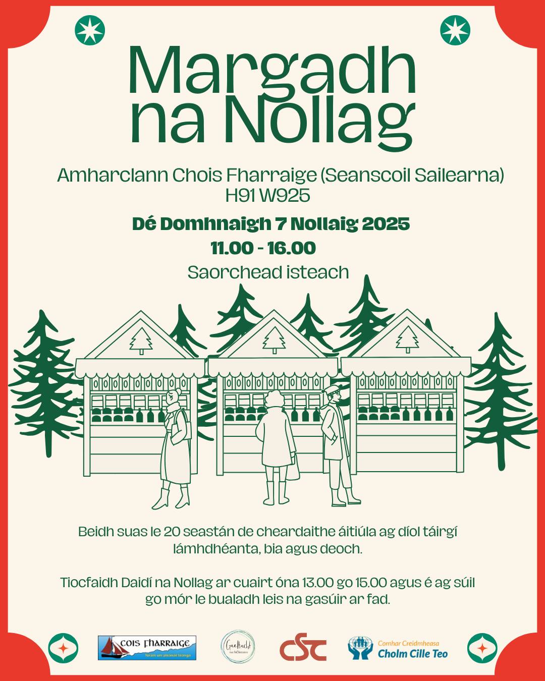 Cuirfear Margadh na Nollag ar bun in Amharclann Chois Fharraige (Seanscoil Sailearna) ar an Domhnach, 7 Nollaig, ón 11:00am go dtí a 4:00pm it a Beidh suas le 20 seastán ag ceardaithe áitiúla ag díol táirgí lámhdhéanta, bia agus deoch. Gealltar neart inspioráide don té atá ar thóir bronntanais Nollag atá speisialta agus sainiúil. Tá scéala faighte go mbeidh aoi an-speisialta ag bualadh isteach go dtí an margadh freisin an lá sin agus cuairteoir ón Mol Thuaidh ar an mbealach le bualadh le gasúir Chois Fharraige. Beidh Daidí na Nollag ag bualadh le gasúir óna 1:00pm. go dtí a 3:00pm Tá saorchead isteach.