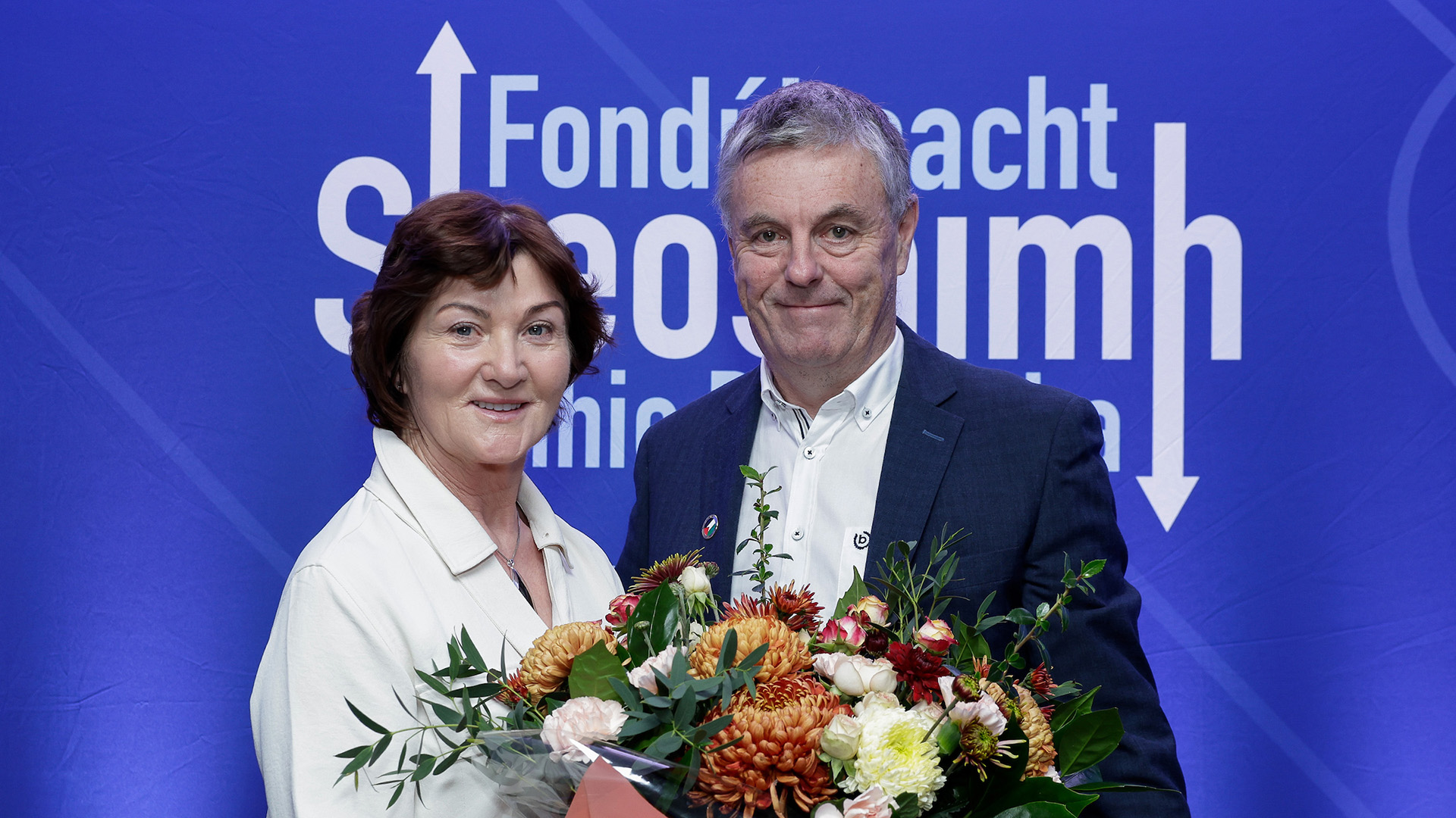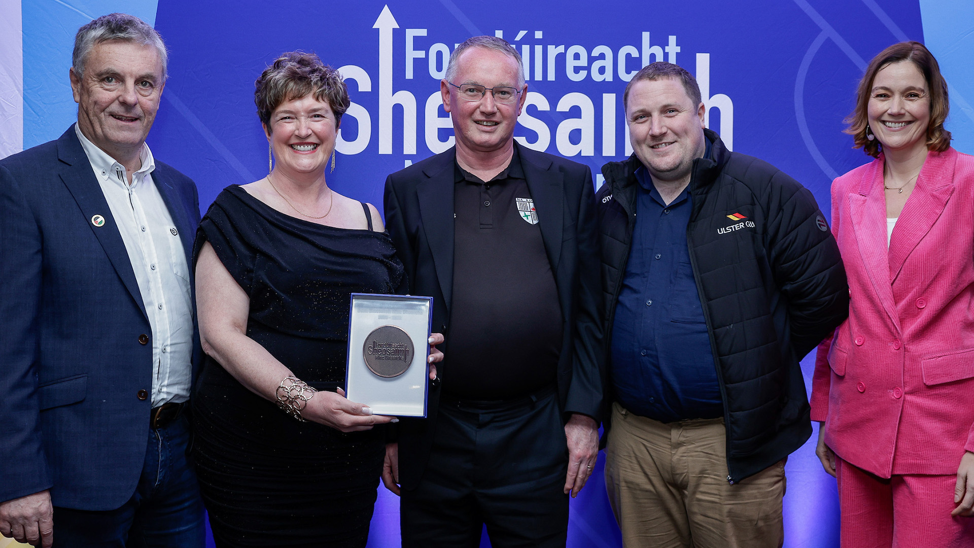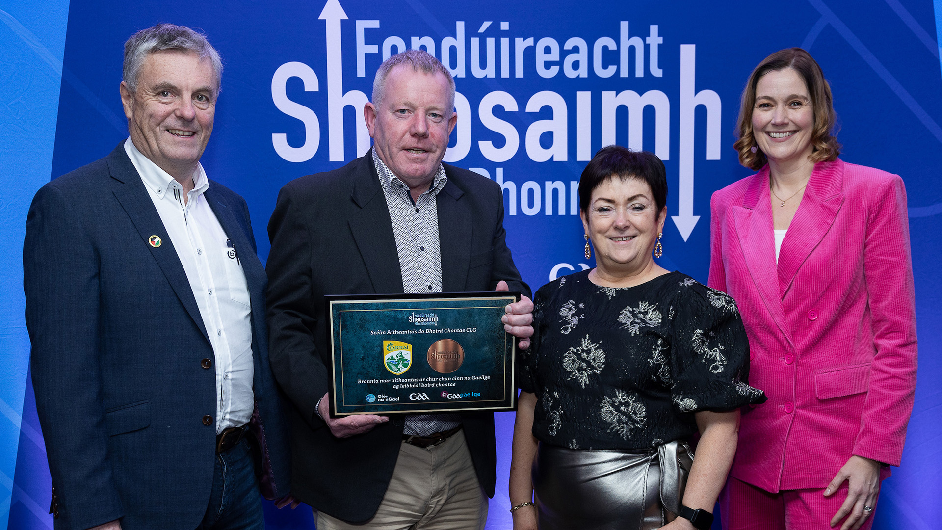 Maureen agus Tony Ó hAnnluain ó CLG Na Rosai gcontae Dhún na nGall ag glacadh le bonn cré-umha de chuid Fhondúireacht Sheosaimh Mhic Dhonncha ó Lorcán Mac Gabhann, Ceannasaí Ghlór na nGael, Ciarán Mag Uidhir, Oifigeach Gaeilge CLG Uladh agus an láithreoir spóirt Gráinne McElwain