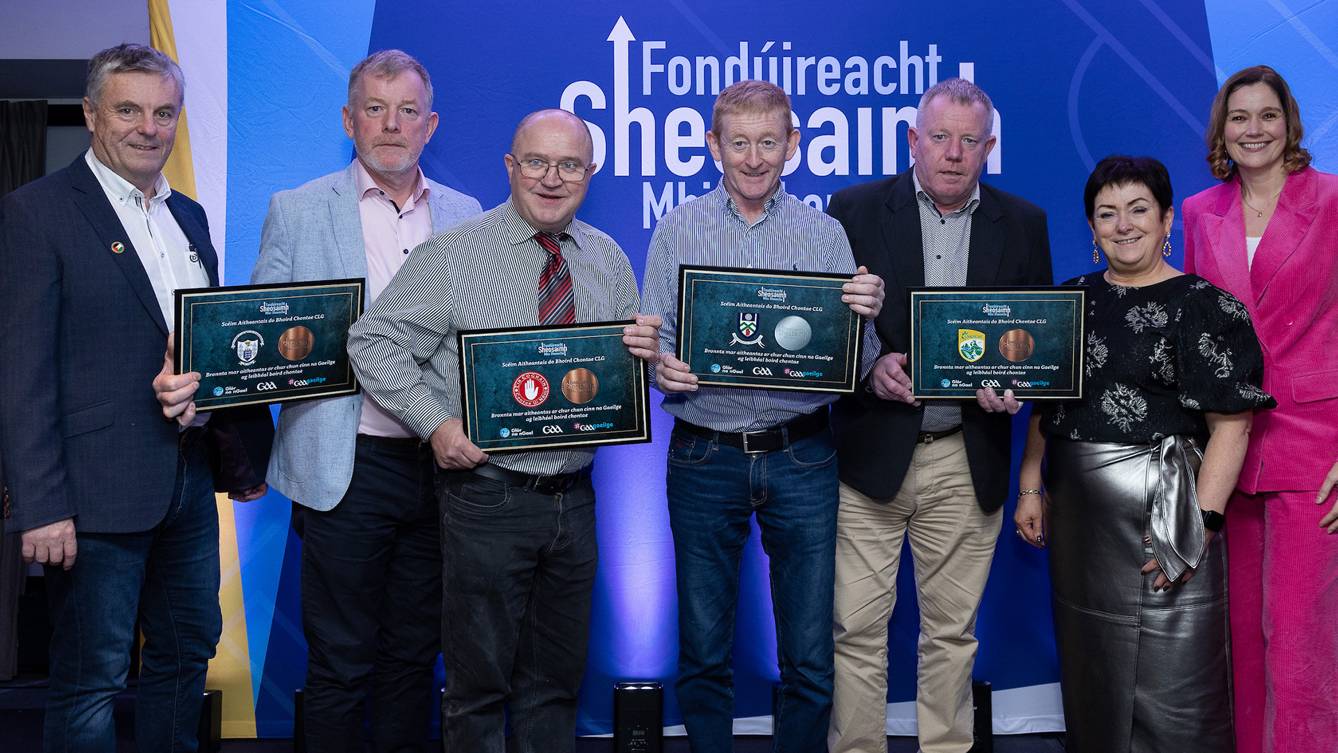 Dónal Ó hAiniféin, An Clár, Éamon Campbell, Tír Eoghain, Mickey Corrigan, Muineachán agus Tomás Ó hAiniféin, Ciarraí, ag glacadh le gradaim dá mboird chontae as cur chun cinn na Gaeilge