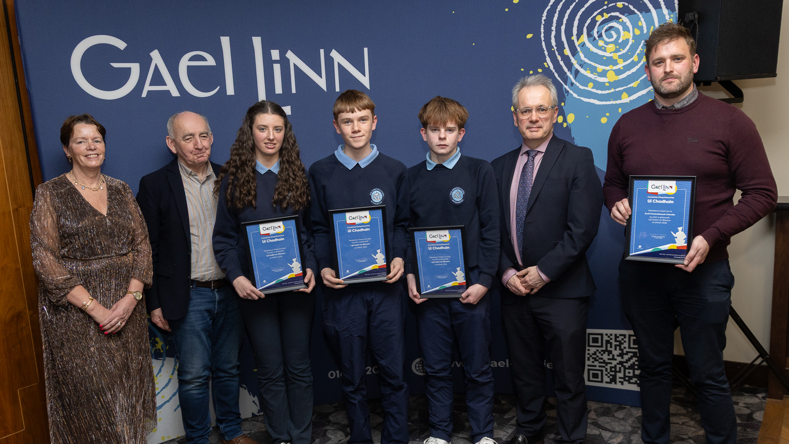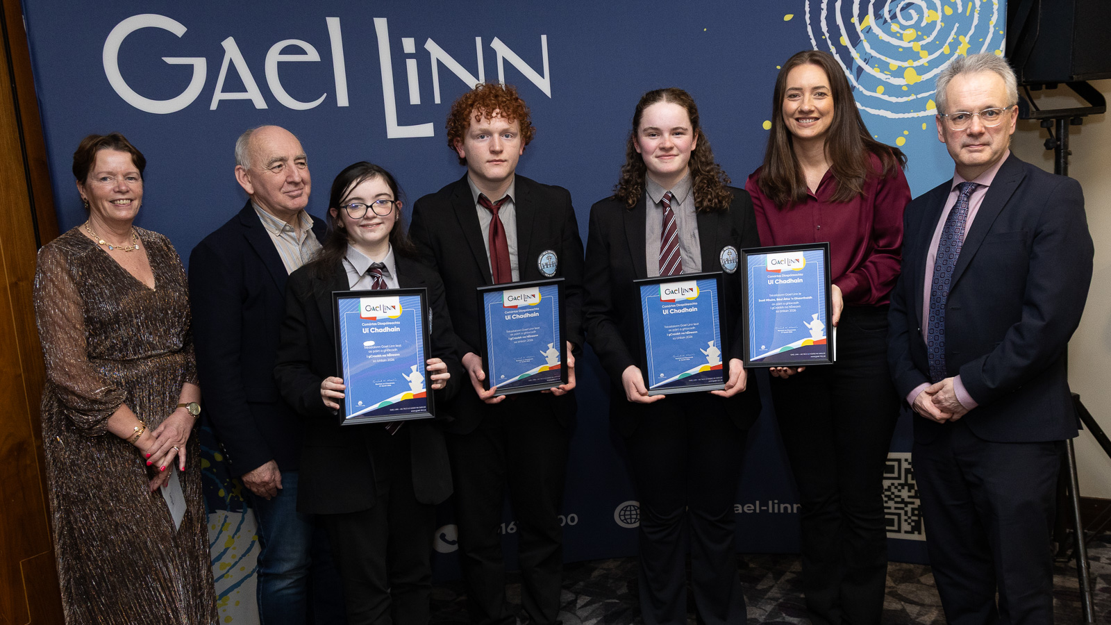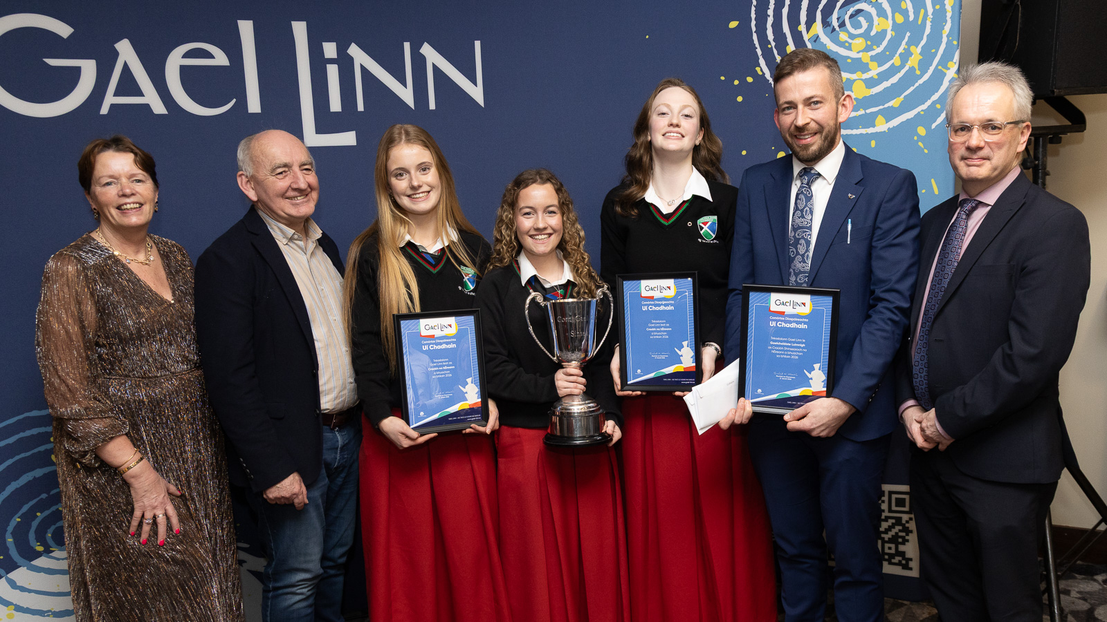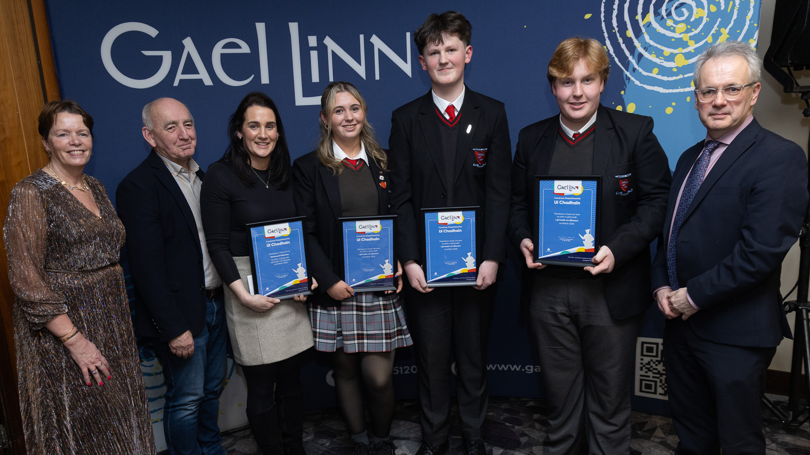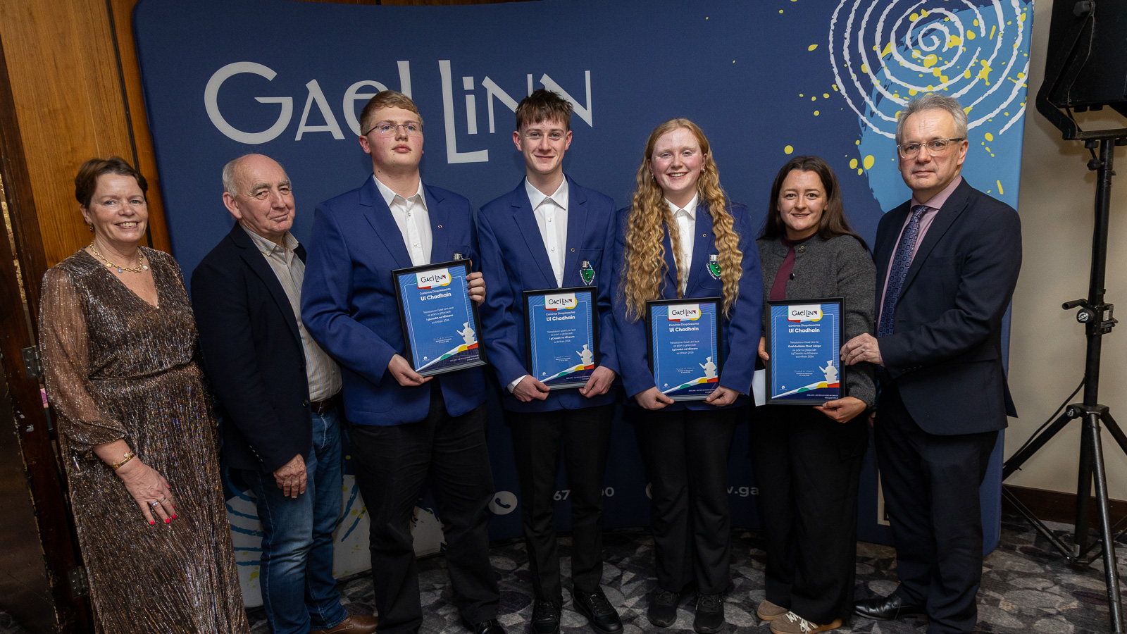 Aoichainteoir agus cathaoirleach Chumann Barra na Gaeilge, Cormac Ó Dúlacháin le foireann bhuacach na sinsear, Gaelcholáiste Luimnigh, Ava Ryan, Lia O’Donoghue agus Neasa Ní Ifirneáin lena múinteoir John de Buitléar. Ar chlé tá Sinéad Ní Mhaidín, Gael Linn agus ar dheis tá Príomhfheidhmeannach Gael Linn, Réamonn Ó Ciaráin