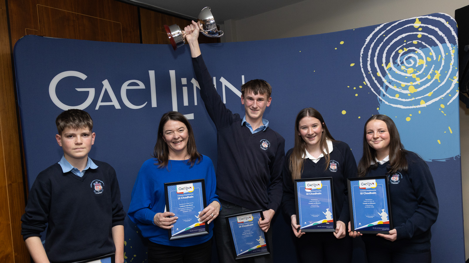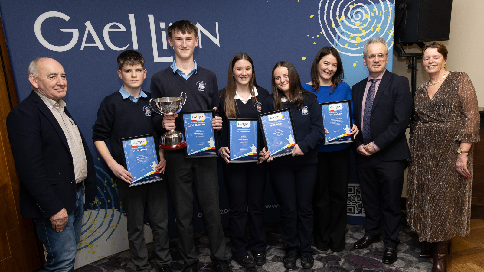 Buaiteoirí Chraobh Shóisir na hÉireann i gcomórtas Díospóireachta Uí Chadhain, foireann Coláiste Chroí Mhuire, An Spidéal, Cuán Canny, Diarmuid Mac Réamoinn Clíodhna Ní Neachtain agus ionadaí Clodagh Ní Neachtain, lena múinteoir Bróna Ní Uallacháin.