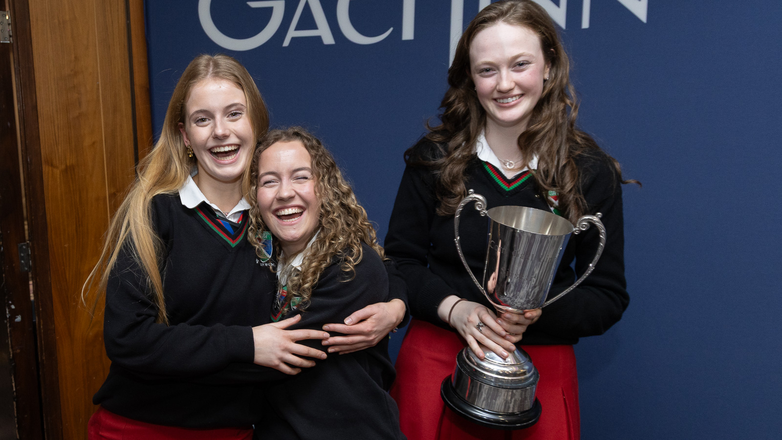 Foireann shinsir Ghaelcholáiste Luimnigh, Ava Ryan, Lia O’Donoghue agus Neasa Ní Ifirneáin ag ceiliúradh a mbua i gCraobh na hÉireann 2026 i nDíospóireacht Uí Chadhain Gael Linn le comhscoláirí agus múinteoirí
