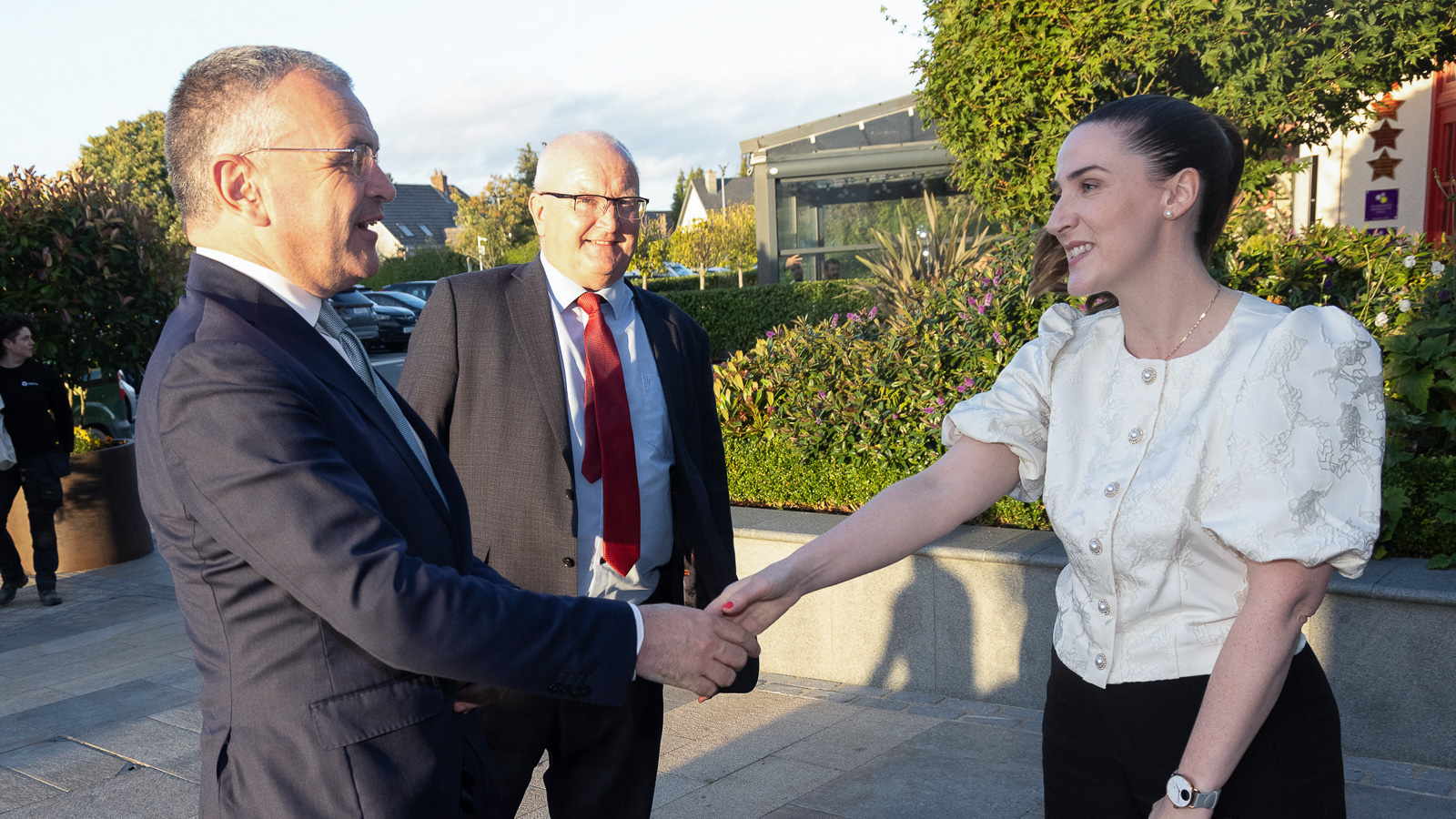 Aoife Ní Ghloinn, Stiúrthóir Lárionad na Gaeilge, ag cur fáilte roimh an Aire Aire Forbartha Tuaithe agus Pobail agus Gaeltachta, Dara Calleary