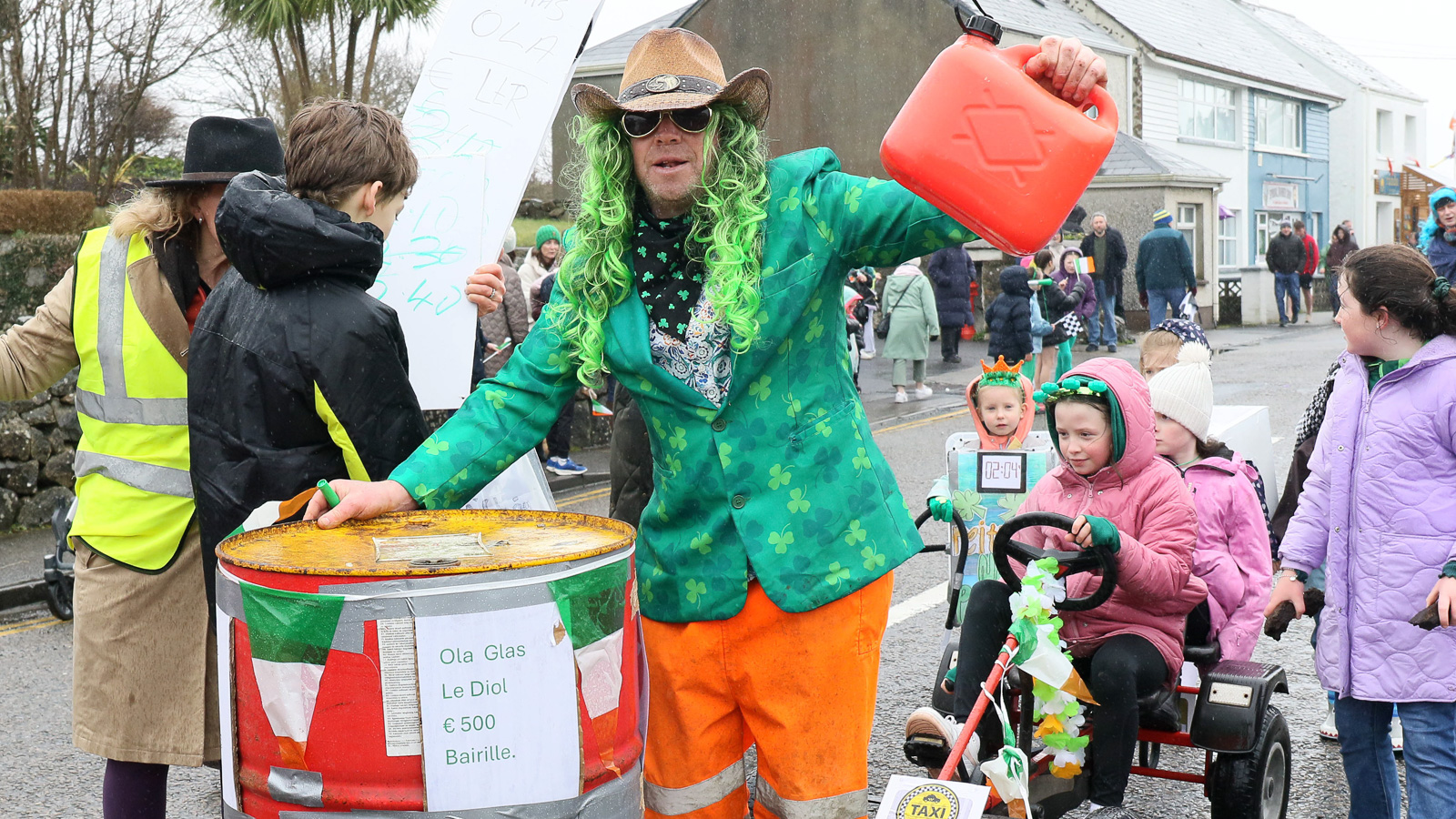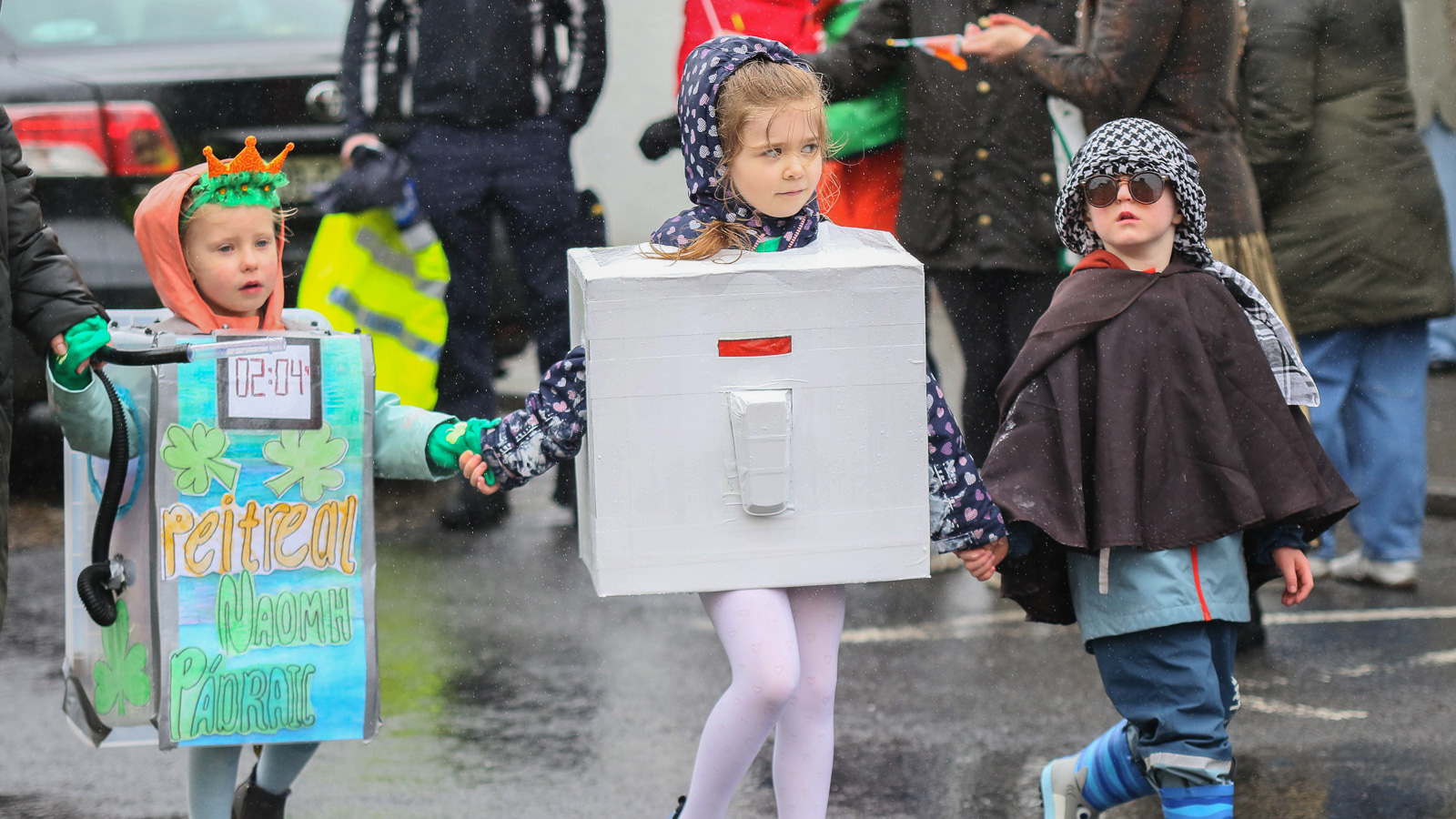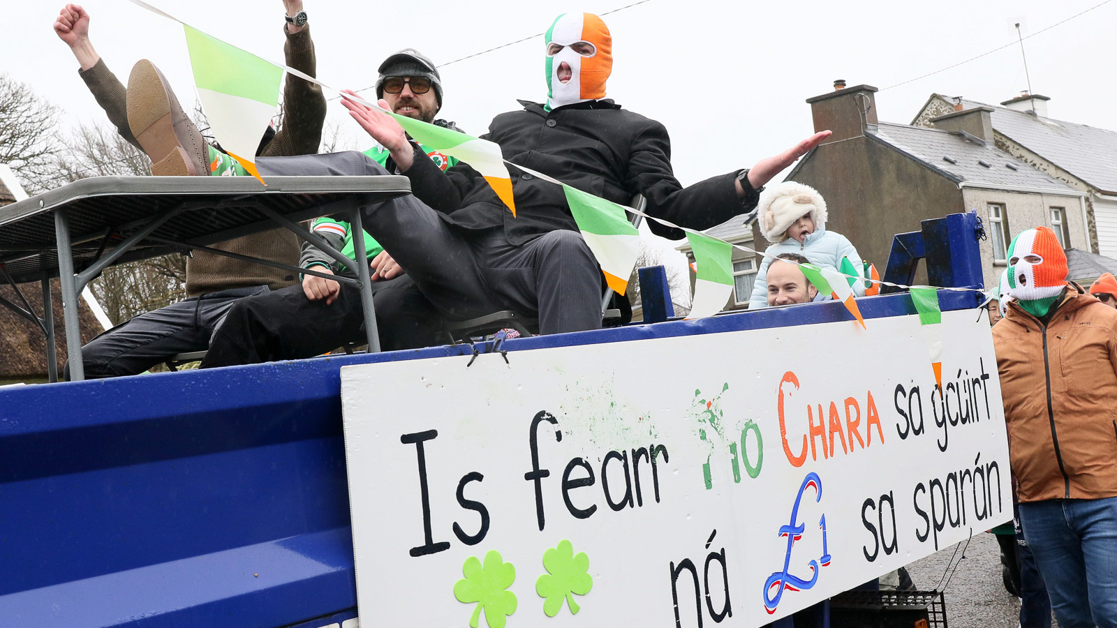 Fág freagra ar 'GAILEARAÍ: Kneecap agus Naomh Bríd agus Naomh Padraig ag paráid Lá Fhéile Padraig ar an Spidéal'