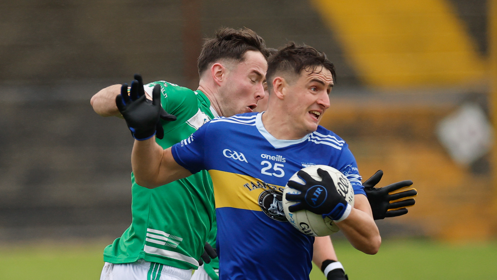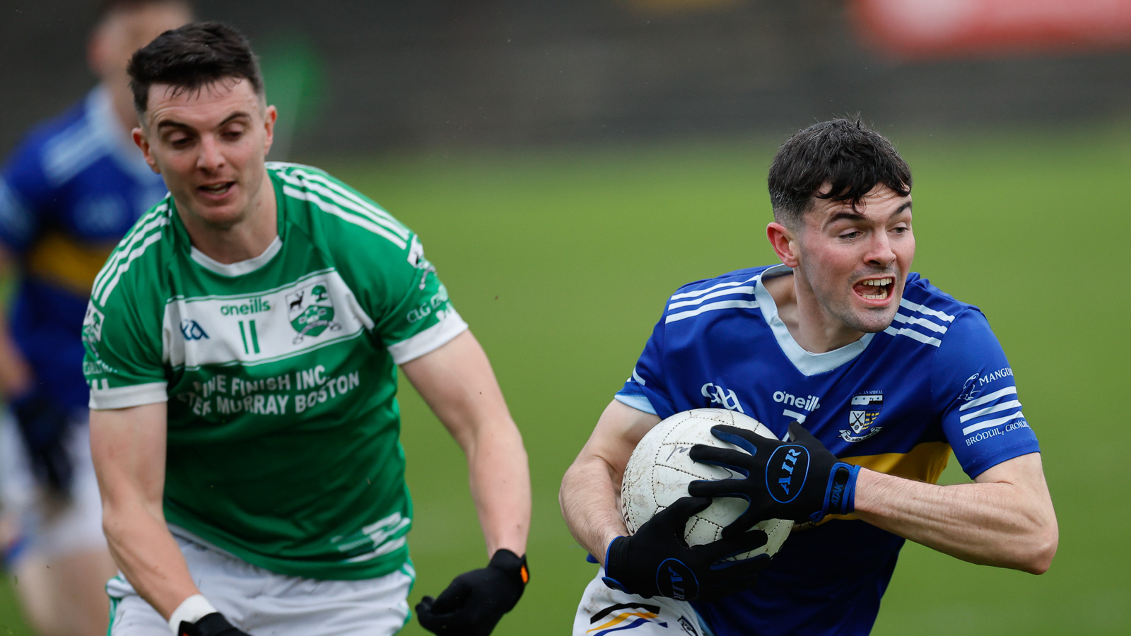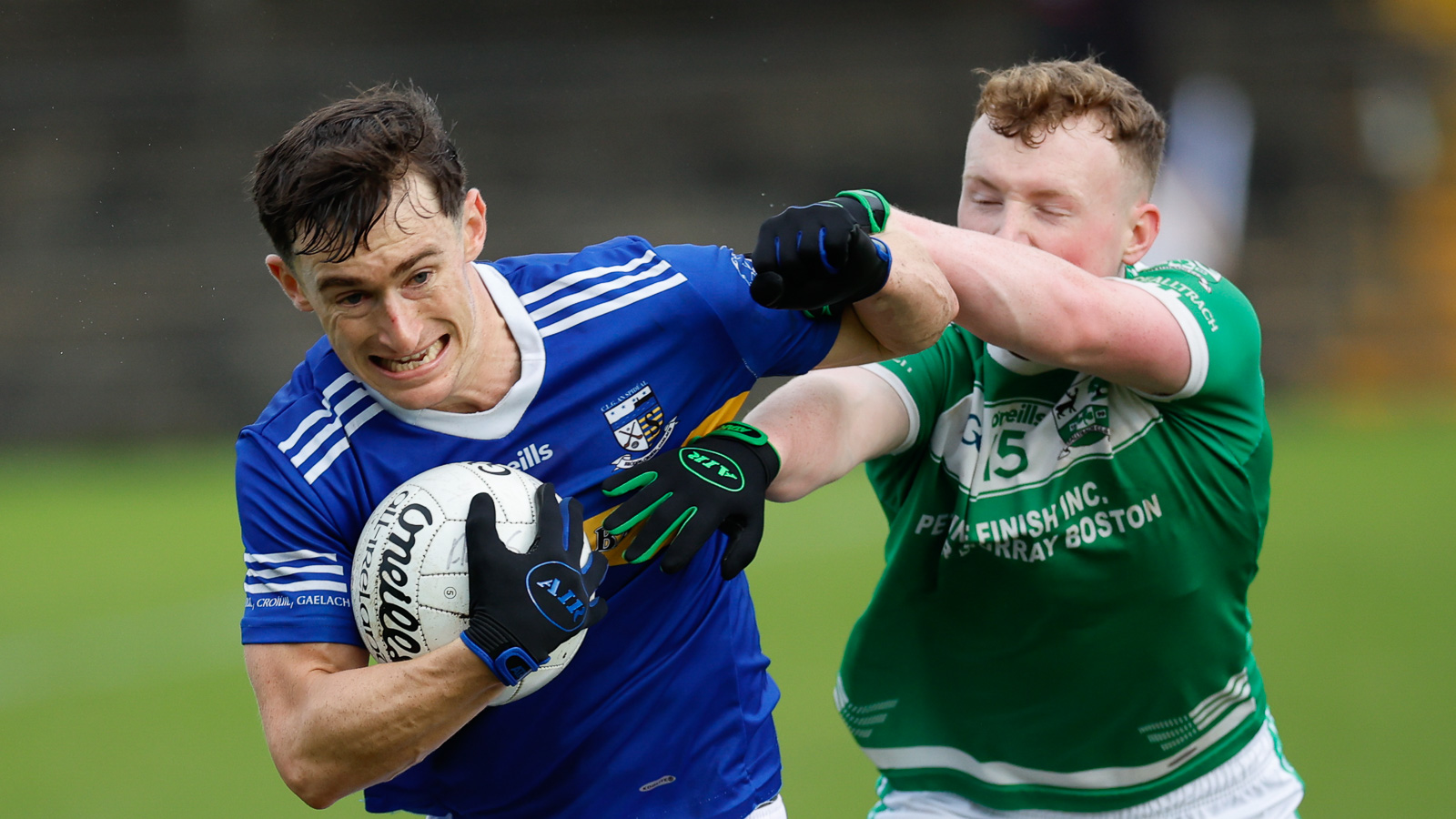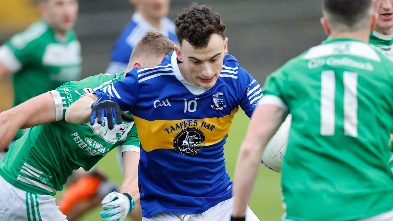 An pheil ag fear na Cealtraí ach é á sháinniú ag Diarmuid Ó Droighneáin, Cillian Ó Laoi agus Diarmuid Ó Duinn an Spidéil