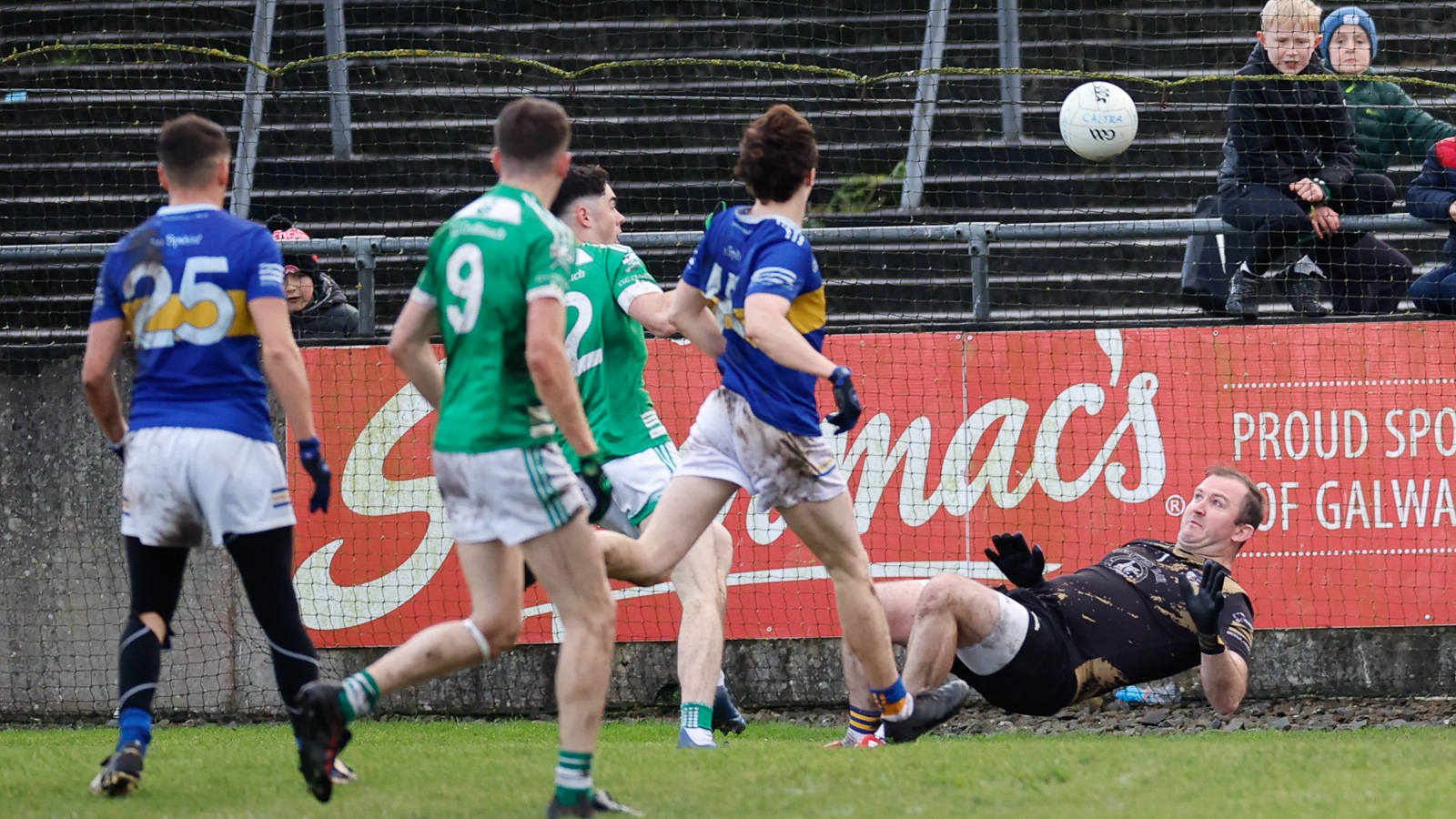 Maghnus Breathnach, An Spidéal, ag seoladh cic saor idir na postaí le dhá phointe a scóráil. Pic: Seán Ó Mainnín/Tuairisc