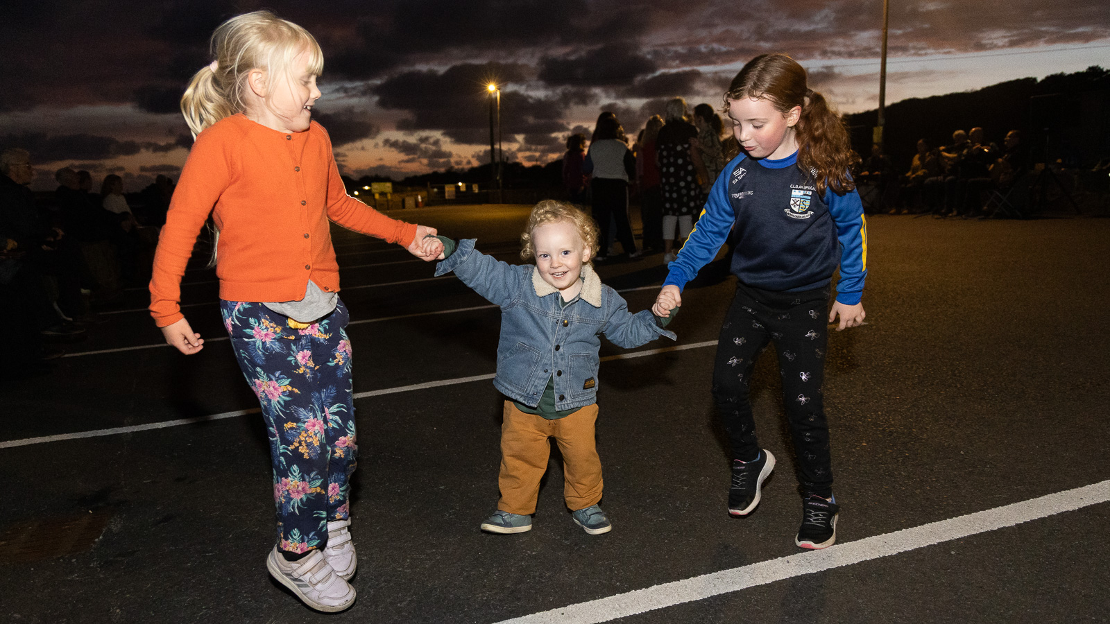 Céilí le luí na gréine. Ó chlé: Sandra Riordan, Evelyn, Elodie (6) agus Isola Quinlan (9), Na Forbacha, ag cleachtadh Bhallaí Luimnigh ar bhallaí na Seanchéibhe, sa Spidéal ag céilí Oíche Chultúir.