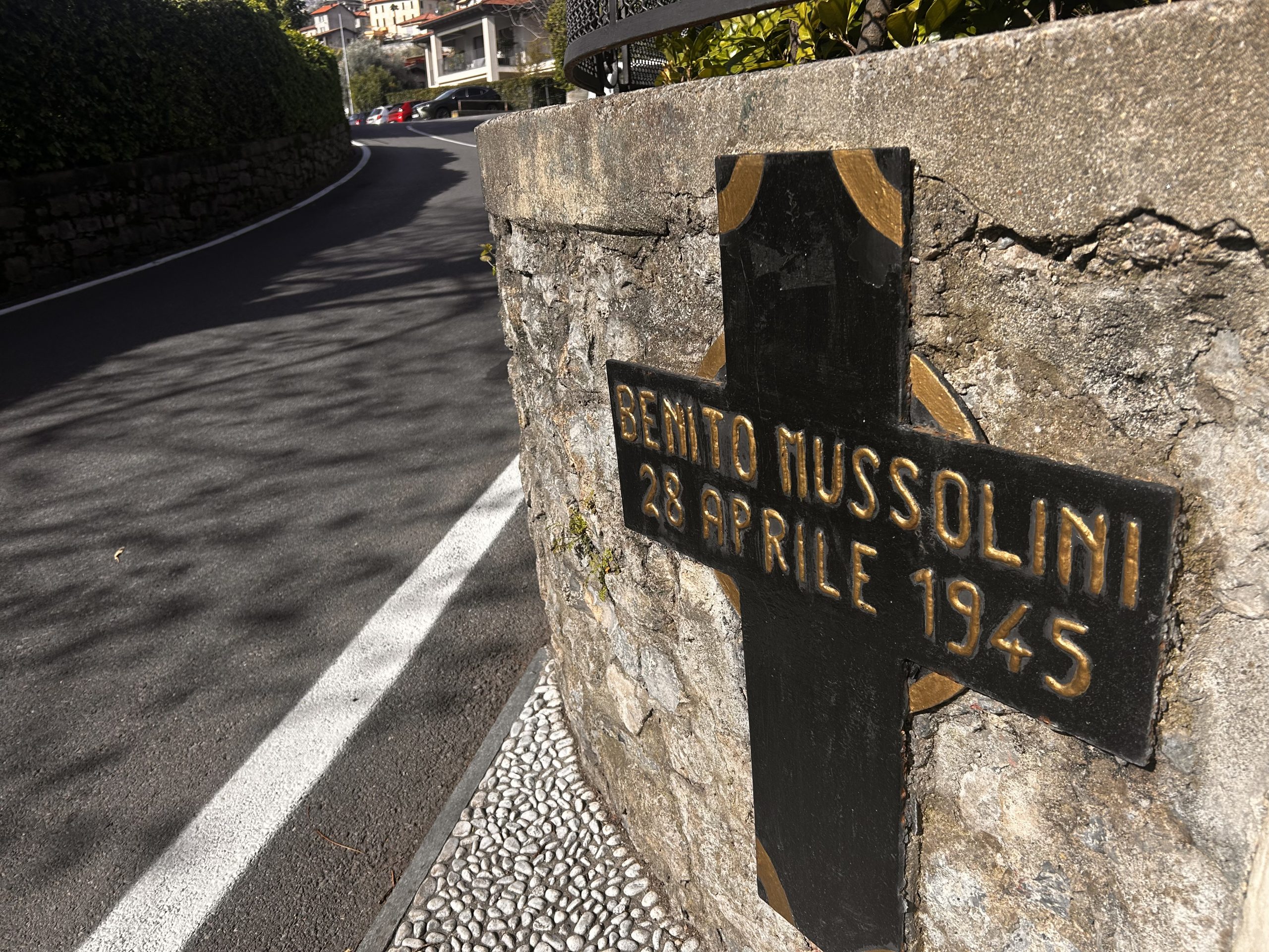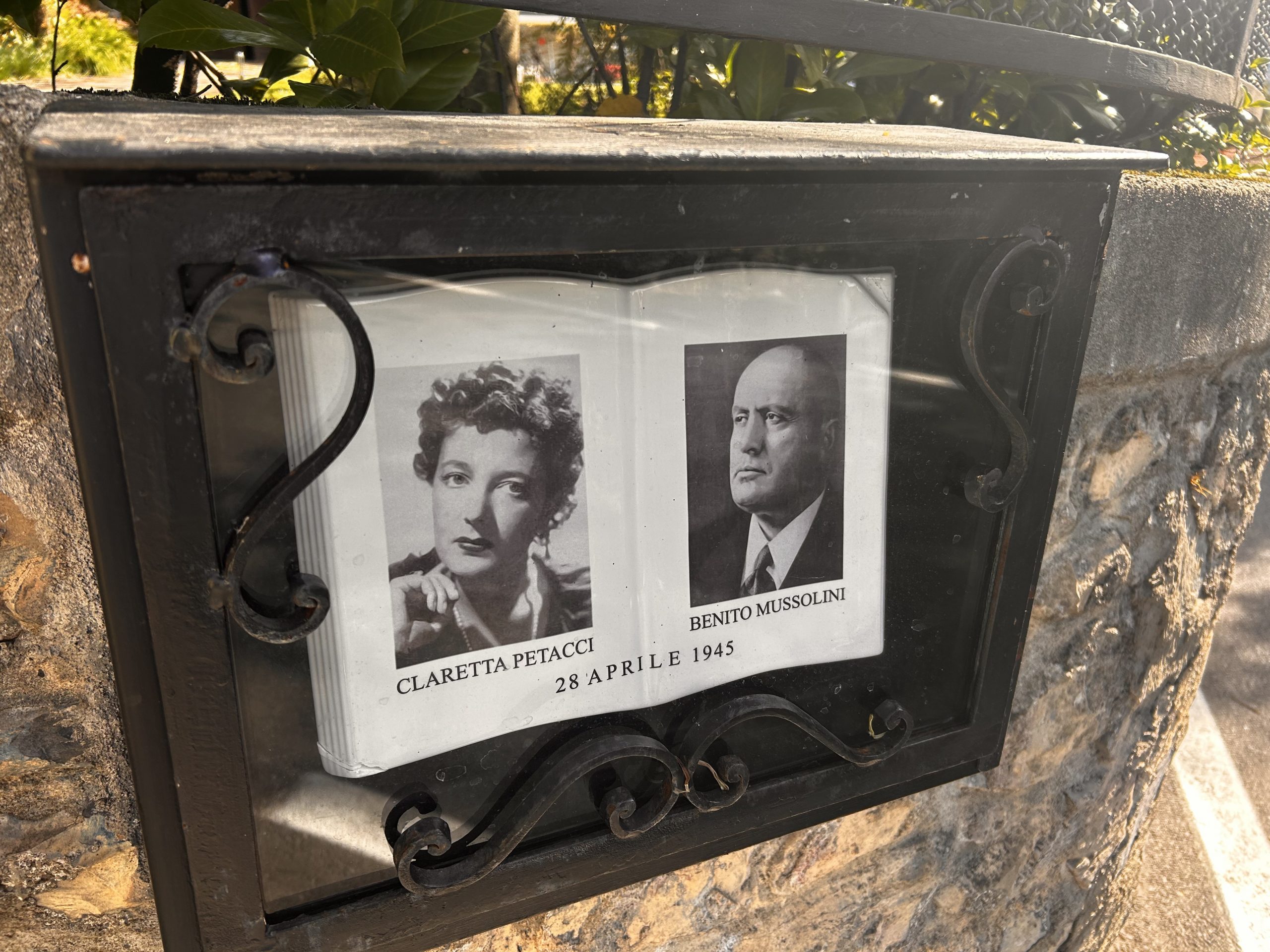 Tá an geata agus an áit thart air, díreach mar a bhí i 1945. Greamaithe don dá phosta, tá pictiúir dubh agus bán den bheirt, Mussolini agus Petacci. Agus cros mhór dhubh lena ainm siúd – díreach mar a bheadh ar láthair timpiste bóthair nó a leithéid sa tír seo.