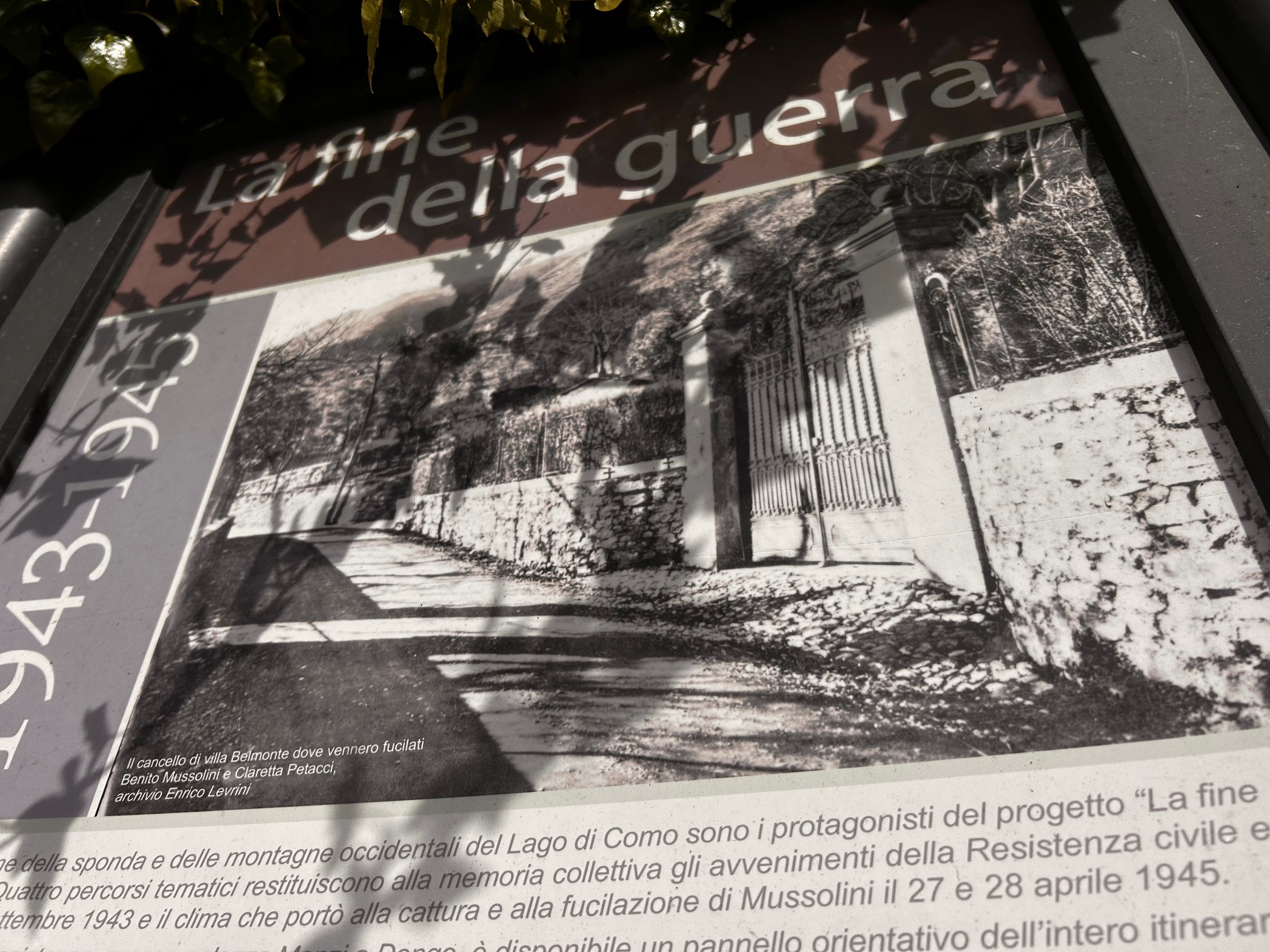 Tá neart eile faoi dheireadh an chogaidh le feiceáil thart sa cheantar – ‘La Fine della Guerra’ mar a thugann siad ar thogra staire a insíonn chuile scéal faoin deireadh. Níl ann ach gur mheas mé go raibh siad ag iarraidh gan a bheith ag déanamh mórán faoin láthair ar ar maraíodh Mussolini féin. Tá seans ann nach bhfuil siad ag iarraidh go mbaistfí ‘laoch’ air.