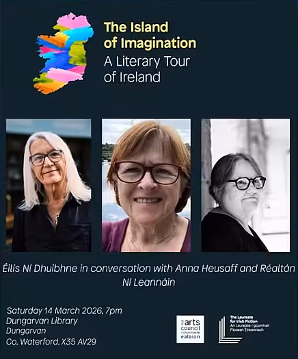 Beidh an Laureate don Fhicsean Éireannach Éilís Ní Dhuibhne ag teacht go Leabharlann Dhún Garbhán an tseachtain seo chugainn. Ócáid dhátheangach a bheidh ann agus Éilís ag caint leis na scríbhneoirí Gaeilge Anna Heussaff agus Réaltán Ní Leannáin. Tá fáilte roimh chách go dtí an ócáid a bheidh ar bun ar an Satharn an 14 Márta ag 7pm. Níl aon táille ar an ócáid ach moltar áit a chur in áirithe roimh ré. Is féidir áirithint a dhéanamh ach glaoch ar 058 21141 nó r-phost a sheoladh chuig DungarvanLibrary@waterfordcouncil.ie